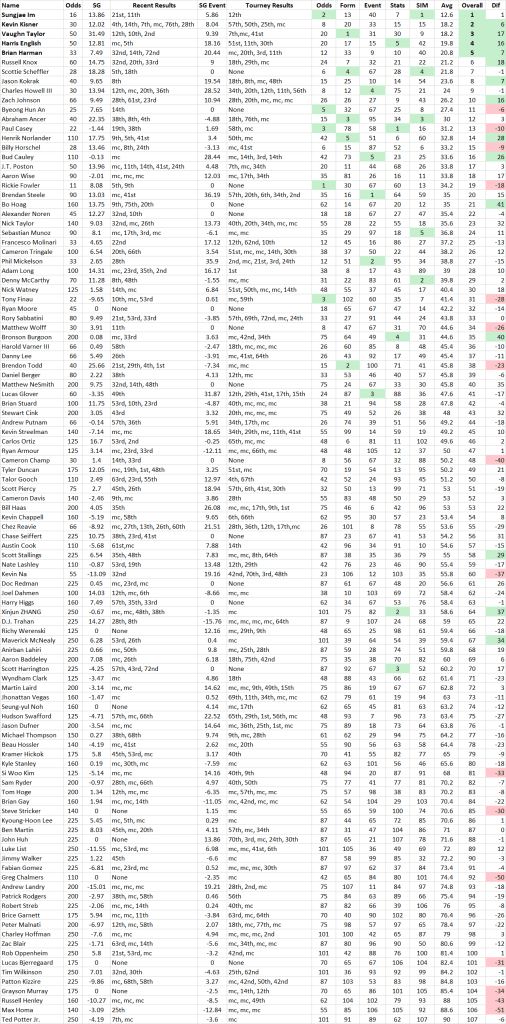 Historically we have seen low scores winning this thing, with three separate players shooting a 59 in tournament play, and unless the wind gets to gale force this week should be no exception. Due to that I’ve factored in Strokes Gained: Approach, Birdies or Better Gained, Strokes Gained: Ballstriking and Strokes Gained: Par 5’s as my main stat categories this week.